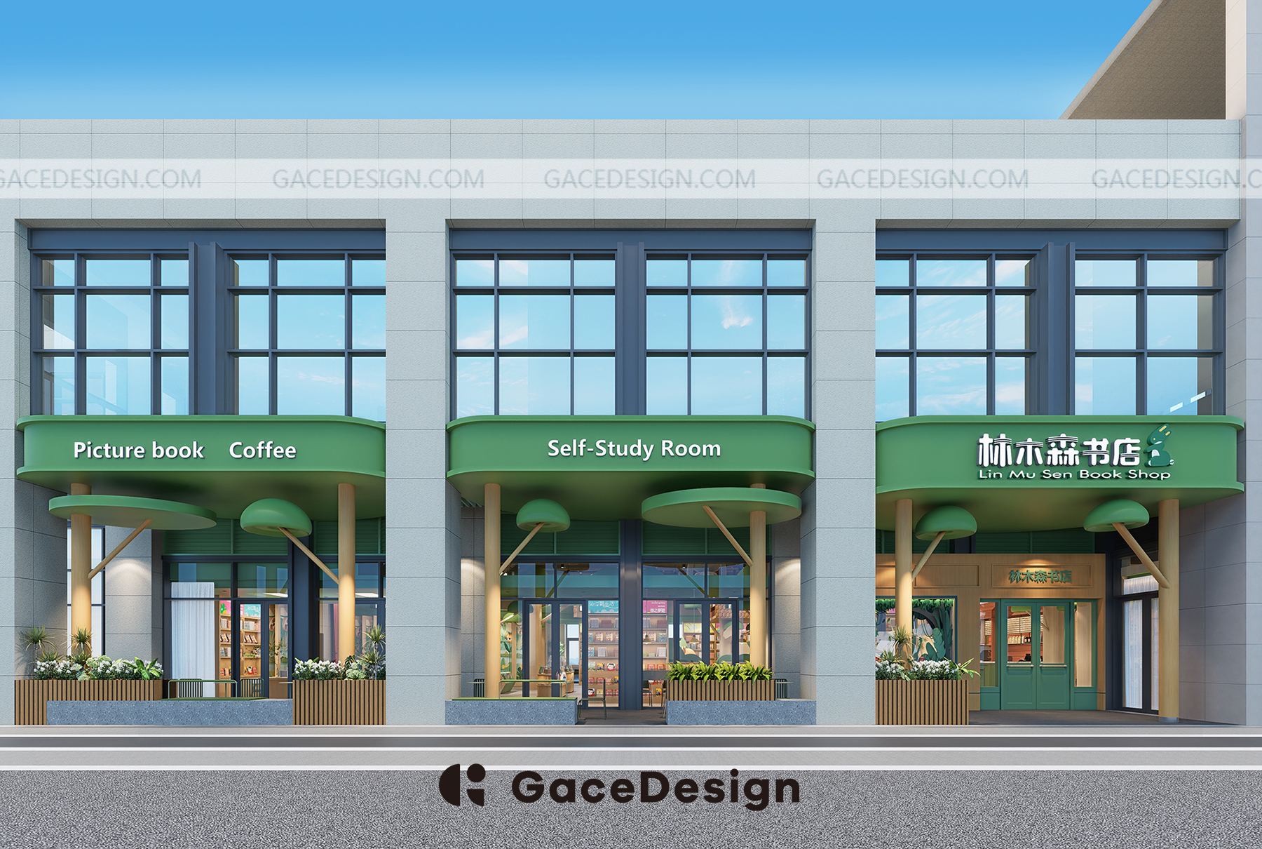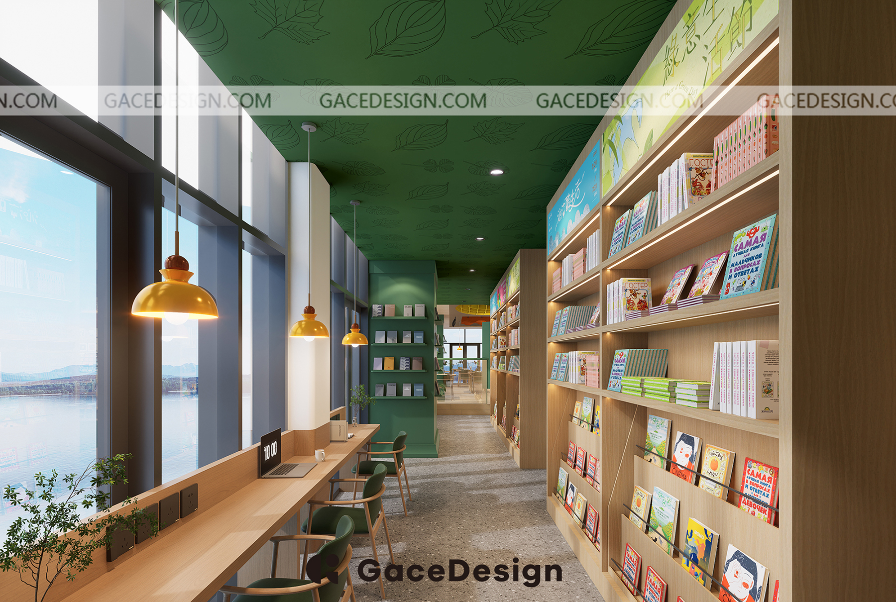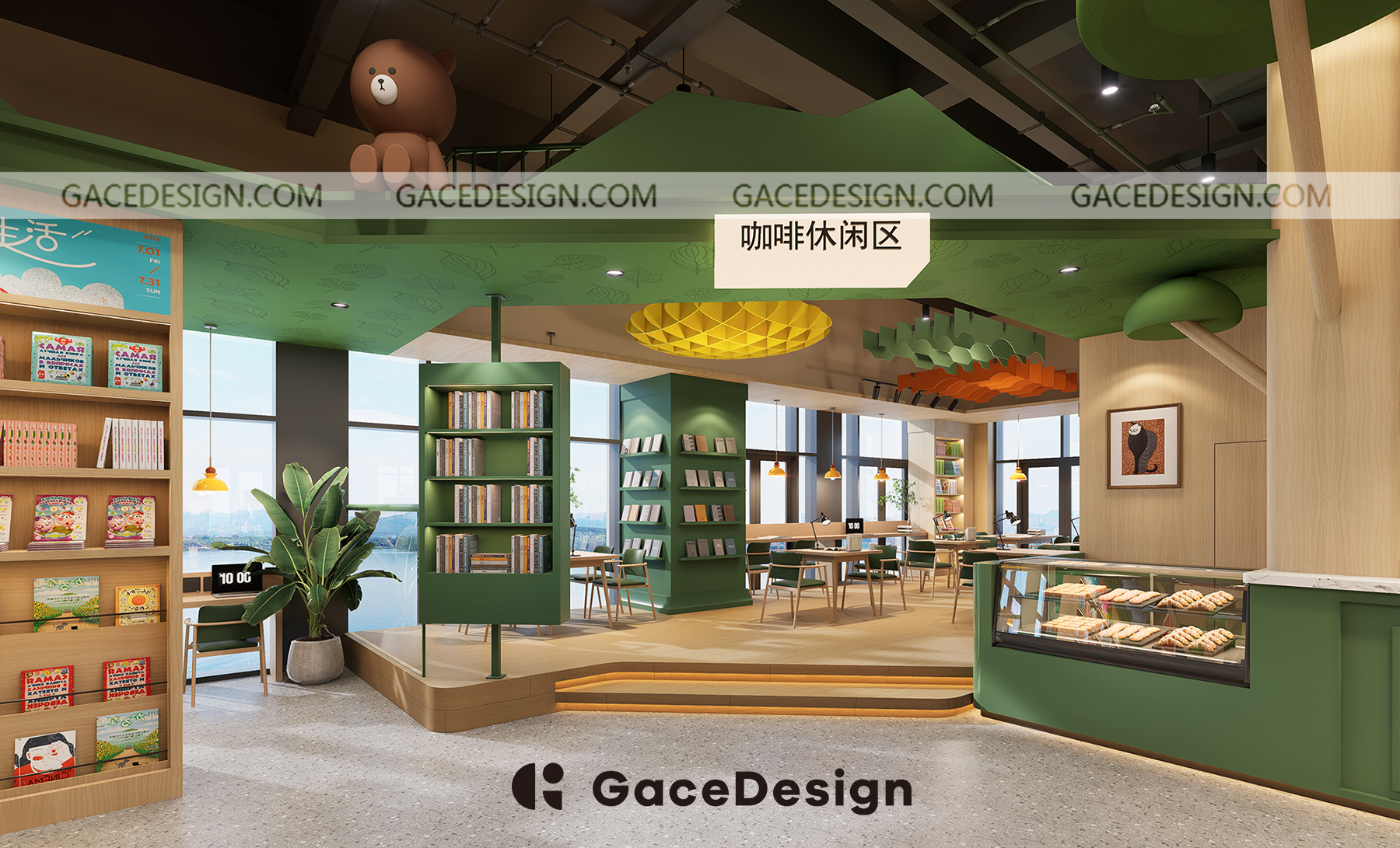 ? “笨狼家·林木森書店”坐落于湘江新區美麗的梅溪湖畔,是以笨狼媽媽湯素蘭童話作品為元素打造的兒童成長、休閑閱讀空間。 旁邊還有一條清澈的梅溪湖,周邊的自然風景很優美。設計師在設計上運用大面積落地玻璃,將內外景觀融合,讓自然與室內結合。