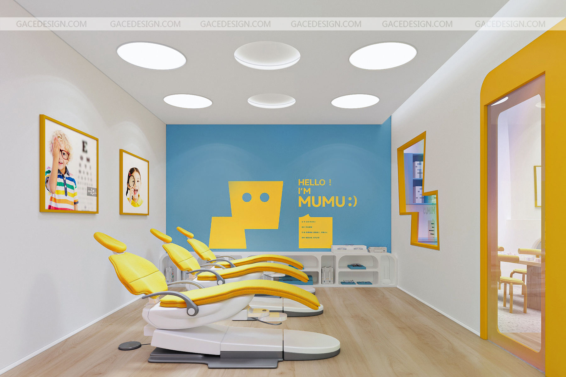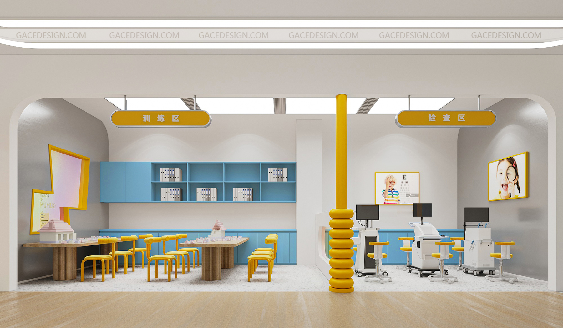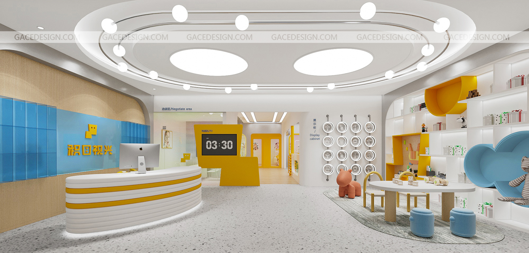 設計說明:將品牌IP最大化融入到空間。以鮮明的品牌形象色,傳達了引領行業趨勢的新理念。友好的圖形具象化,強烈的對比色在市場打出差異化。讓整個場景與兒童體驗起來更生動有趣。,所有的尺寸根據兒童的人體工學進行搭配。每一個小細節都對兒童友好。一切都是圓的,沒有可以撞到的角落。