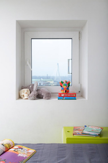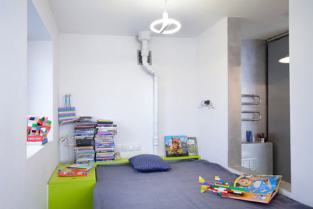 除了迎合兒童口味的亮麗色調(diào)外,室內(nèi)還可以看到多處節(jié)省空間的精巧設(shè)計(jì),如可以閉合的廚房&餐廳、位于門廳的浴室、便于儲(chǔ)物的墊高的床等,以滿足兒童對(duì)視野和活動(dòng)空間的需求。
