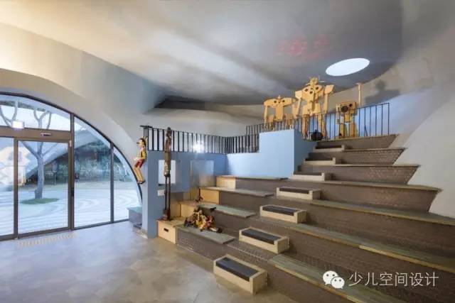 第一棟樓(波浪與鯨魚)試圖表達一種受匹諾曹故事啟發(fā)的空間,大風暴和鯨魚等主題都進行了表現。平面布局采用了曲線,讓人想到子宮內蜷曲的胎兒。平面之后演變成了鯨魚與波浪的結合,最終融為一體。大臺階與小臺階營造的座椅間營造的狹長扭曲空間試圖增強空間的游戲性與冒險感。不幸的是,這里暫時關閉。被建筑圍合起來的不封頂的凹坑狀空間在天氣好時可以作為室內空間的延伸。由于所有的窗戶可以折疊和推到兩側,許多室內的概念與設計都可以被盡可能地實現,但是出于內容與安全考慮只有中間區(qū)域可以安置這樣的內容。