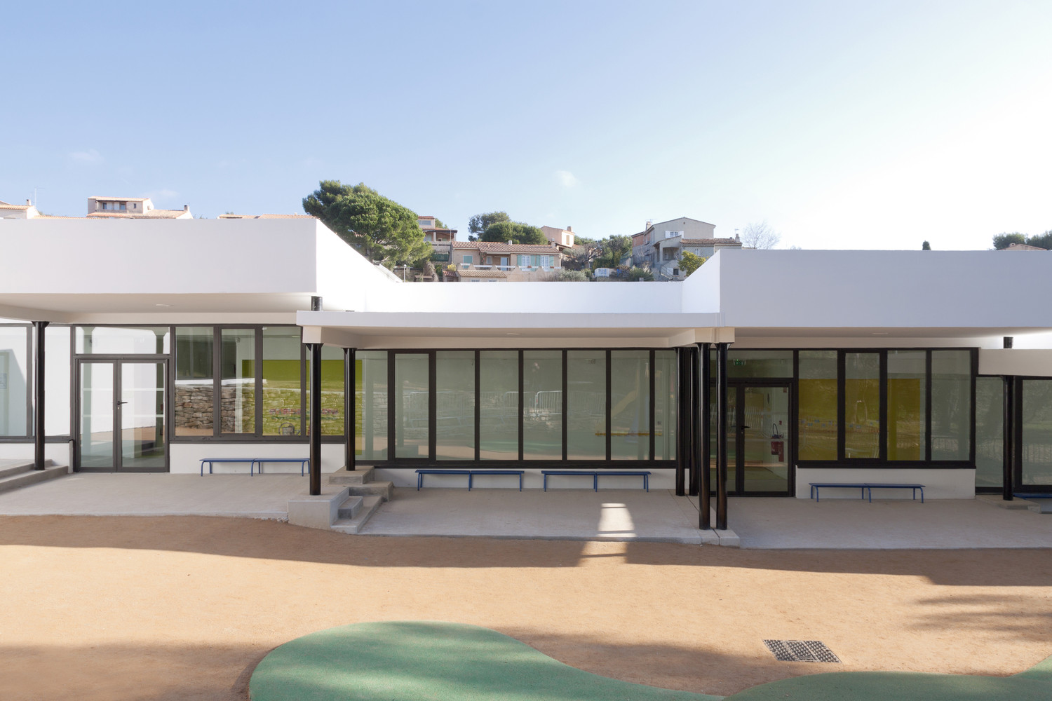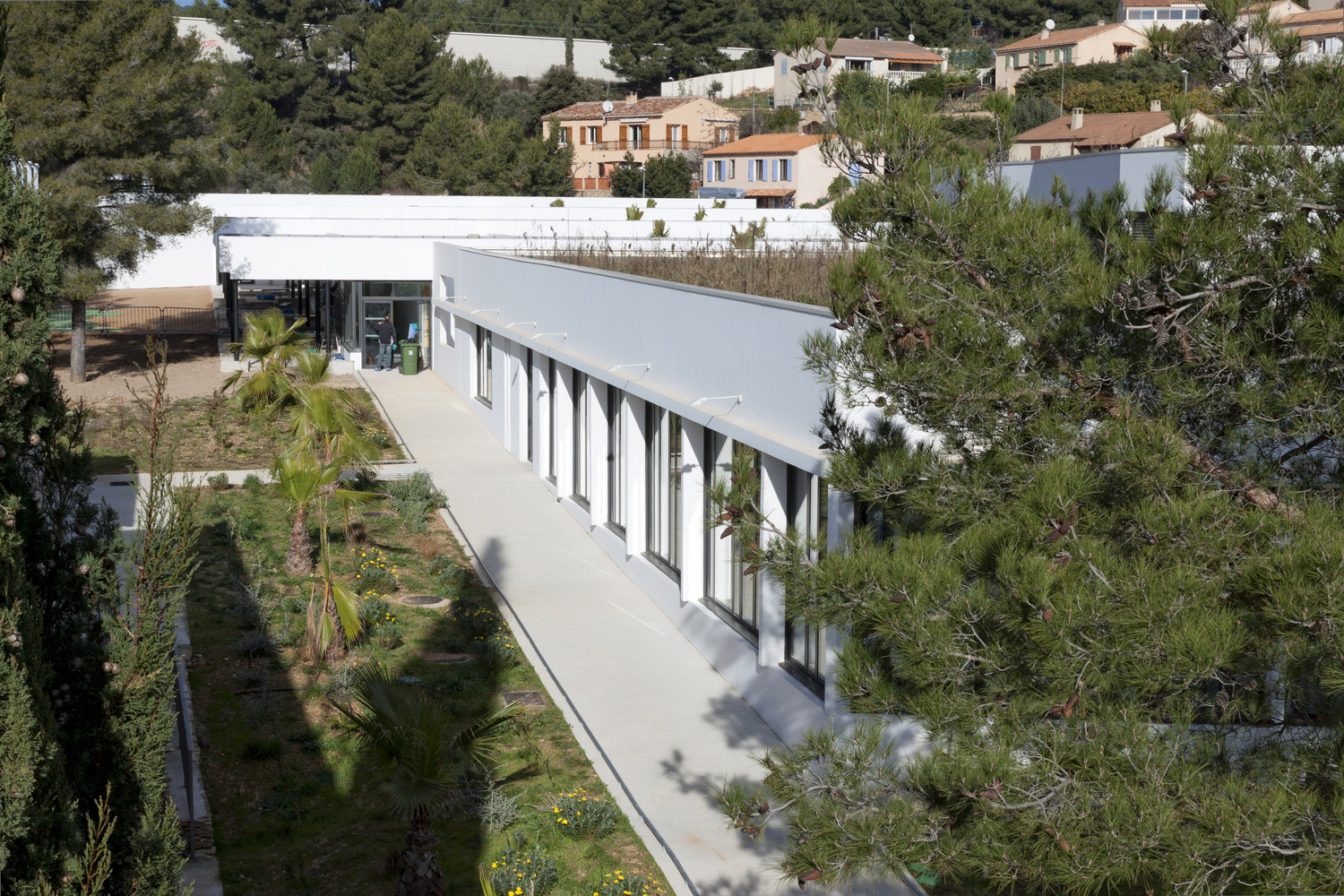 位于法國的Les Severiers幼兒園這個幼兒園設計包括著三個部分,一個食堂和在Ciotat的住宅區內的城市化發展。園方的想法是建造一個可以使它融入到現存的松樹林中這樣的幼兒園。幼兒園的不同體積微妙地形成了一個緩坡,這可以在學校中形成天然的間隔。