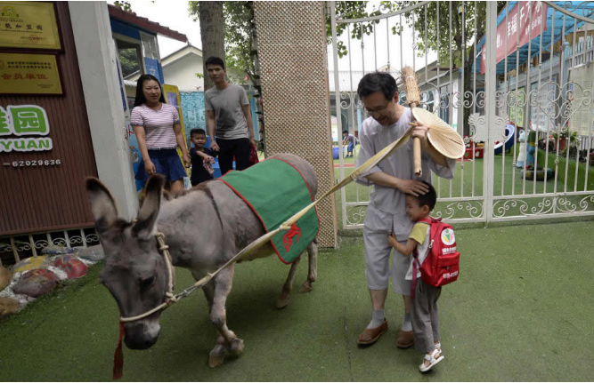 李里牽驢到幼兒園門口接孩子,路上教孩子背《三字經》、《劍門道中遇微雨》