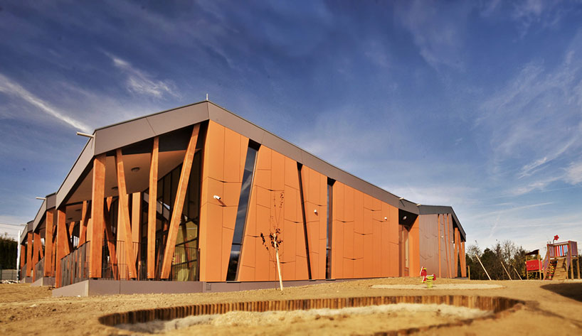 斯洛文尼亞幼兒園Kekec的擴建部分。外圍的墻是用彩色玩具木板制成的。天然的木板可以使孩子們在玩耍中辨識不同的顏色,同時感受到木頭的天然質感。