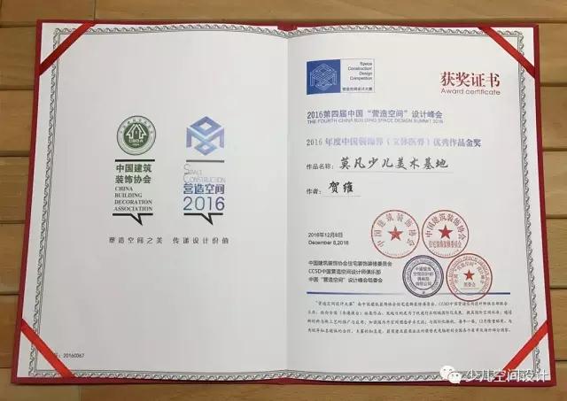 2016年12月,由中國建筑裝飾協會指導,CCSD中國營造空間設計師俱樂部、《飾界人物》雜志社主辦,北京大易尚陽管理咨詢有限公司承辦,聯電國際、輝樂豪銅門、小狗電器共同協辦,各地裝飾協會、中央電視臺、中裝新網、瑞麗家居、《建筑技藝》雜志社、《飾界人物》雜志社、中華建筑報等數十家媒體聯合支持的“2016第四屆中國‘營造空間’設計峰會”在北京天倫王朝酒店正式拉開了帷幕。集合設計項目“莫凡少兒美術基地”榮獲此次“營造空間”的設計金獎。